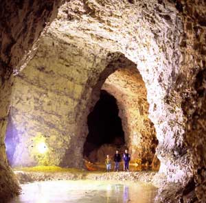 Vi skal køre en tur med minetoget, som kører fra kalkværket forbi de store dynger af flint og kalk, videre gennem det åbne kalkbrud ned til porten og snor sig mellem kalksøjler dybt ind i minerne forbi rislende bække og store underjordiske søer og ender ved biografen.